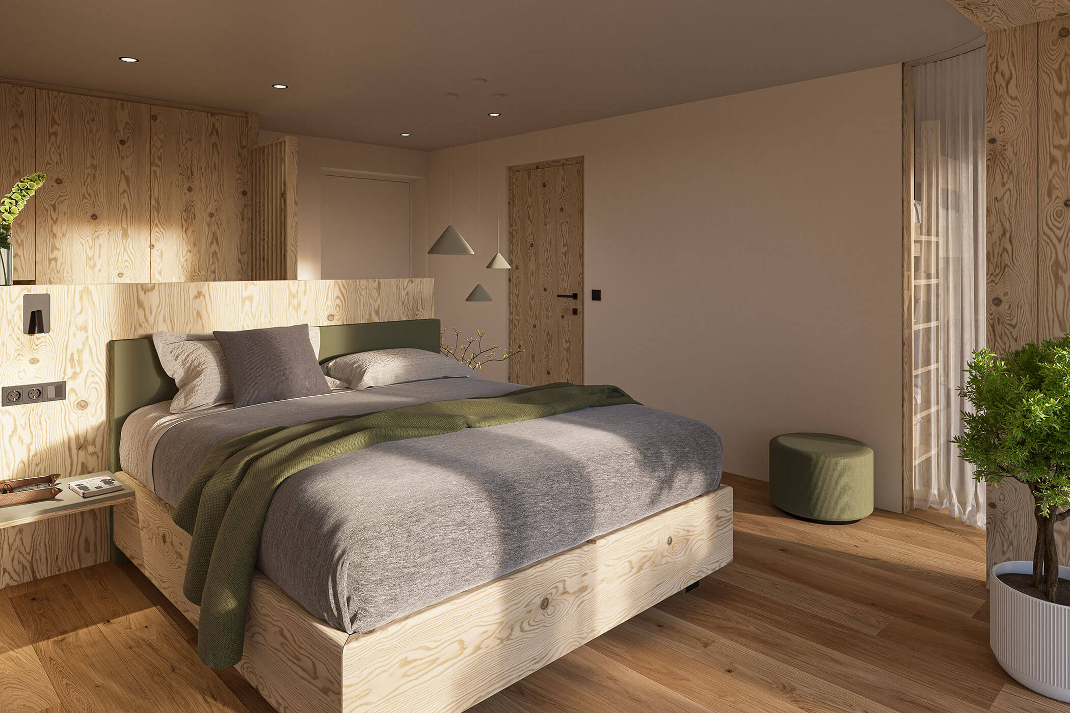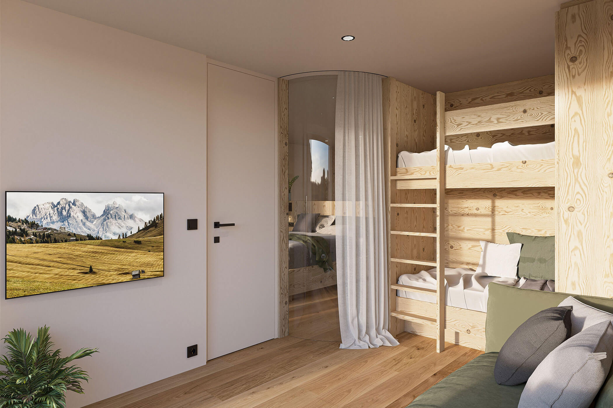 Die individuelle Gestaltung der Suiten mit charakteristischem Altholz bieten alpines Flair in modernem Stil. Die Suiten verfügen über eine Wohnfläche von circa 46 m² und offerieren ein Schlafzimmer mit Massiv-Altholz-Einrichtung, ein zweites Schlafzimmer mit Etagenbett und einer ausziehbaren Couch, ein geräumiges Badezimmer mit Dusche, Bidet, WC, Schminkspiegel und Föhn. In den Suiten finden Sie Bademäntel, in jedem Raum einen Groß Flat-TV mit SAT-Empfang, Safe, Mini‑Bar und kostenloses W‑LAN.